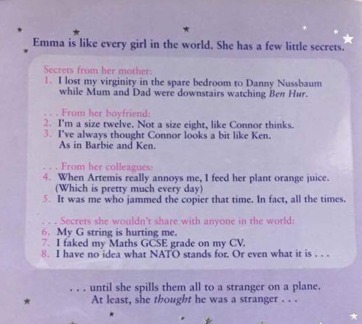 The main character, Emma Corrigan, seems to have it all – a great job, a lovely boyfriend and great friends. All of it seems great on paper. But one minor turbulent plane journey scares her into sharing all of her biggest and most shameful secrets to the man sitting next to her – She lied on her CV about having a C in her maths GSCE and she’s having doubts about her boyfriend, Connor. Little does she know, the handsome, American man on the plane is about to turn her world upside down. He is in fact her boss!